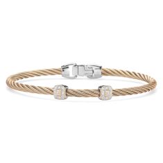 Perfect when worn alone or layered in with other styles, this Cable Essential bracelet from ALOR will give you an updated look. From day to evening, this bracelet is the perfect fashion accessory and features a 3mm carnation stainless steel cable with two diamond-adorned square shaped stations in 18k rose gold and 18k white gold. The diamonds are 1/10ctw, H or better in color, and SI2 or better in clarity. This bracelet is an ALOR clasp bracelet size 7, which fits a wrist measuring 6.0-6.5 inches in circumference.