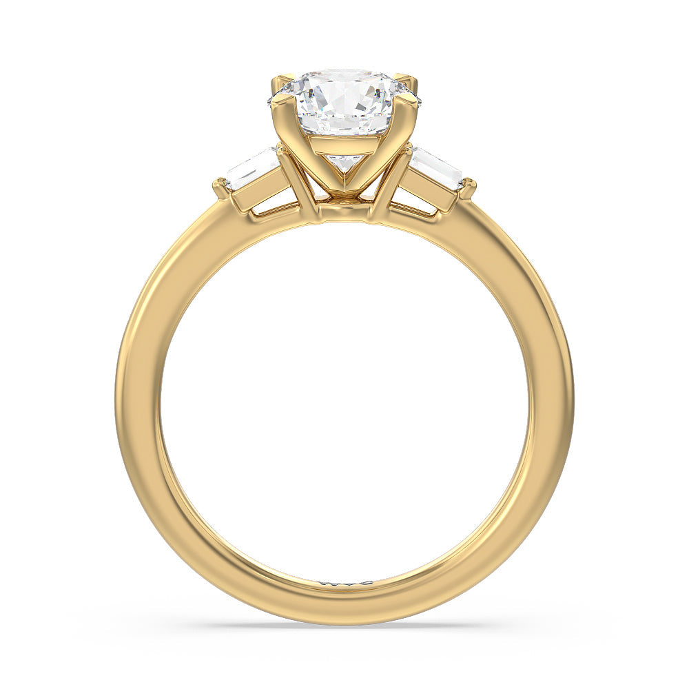 Looking effortless and elegant, this ring is perfect for the minimalist who appreciates neat, clean, and streamlined bling. This three-stone ring has its captivating diamond center stone accompanied by baguette-cut diamond side stones.