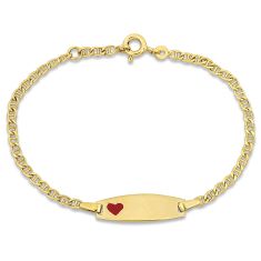 This charming ID bracelet for children features a delicate red enamel heart charm on a 14k yellow gold marine link chain. Measuring 5 inches with an additional 0.5-inch extender, this bracelet offers a comfortable fit that grows with your child. The ID plate adds a personal touch, while the secure spring-ring clasp ensures safe wear, making it a perfect blend of elegance and youthful style. This bracelet measures 6mm in width.
