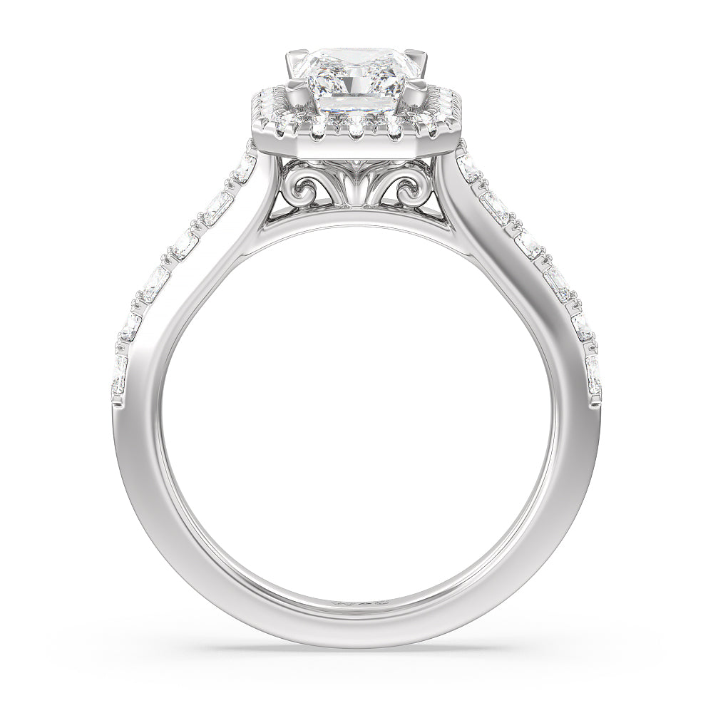 This dazzling ring speaks for itself. It offers a delicate blend of modern and classic with its evenly paved slim shank and the single ring of shimmering diamonds surrounding a center stone. The thin band allows another ring, like a wedding band, to be neatly layered or nested together with this exquisite piece.