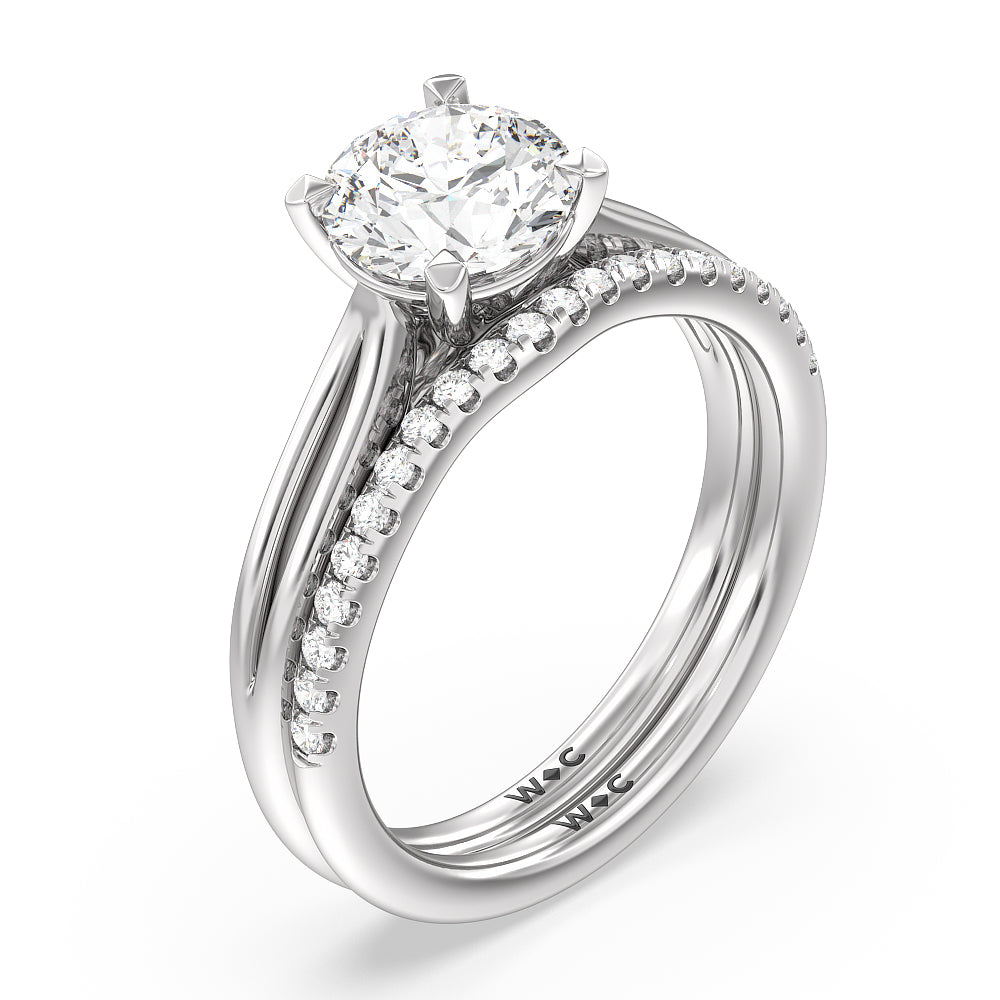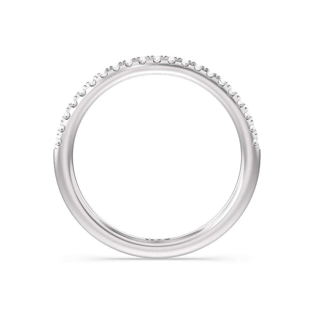 This curved diamond set wedding band is perfectly contoured to complement our delicate pinched cathedral solitaire engagement ring for a simple and sophisticated look.