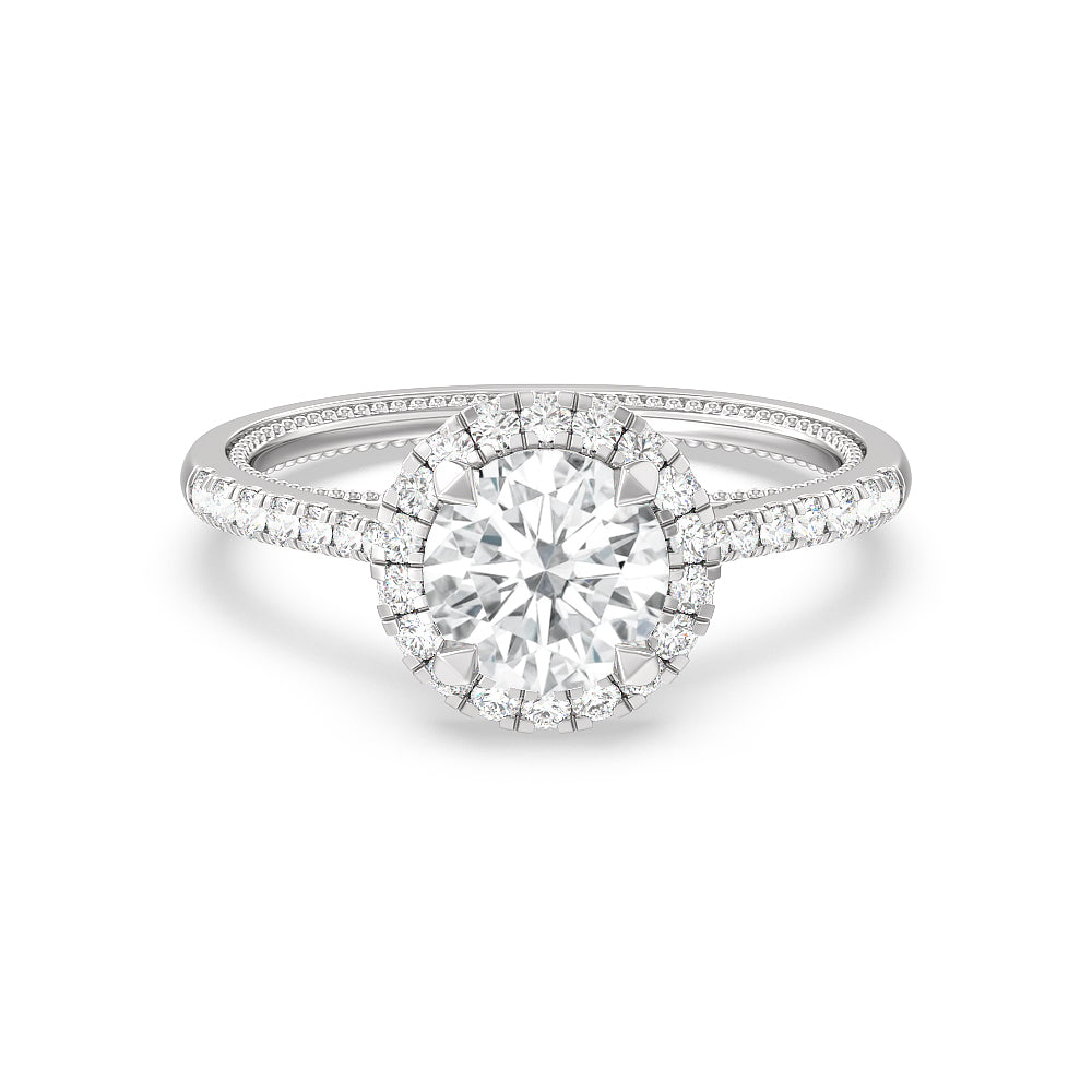 It’s all in the details! This ring features a secondary band incorporated into the design with delicate milgrain for a truly stunning cathedral band. A tapered pave band leads to the diamond halo to really showcase the center stone.