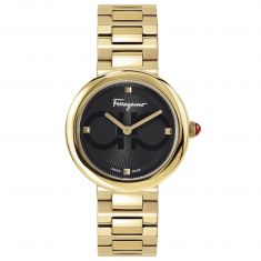 From Salvatore Ferragamo, the Gancini watch will monitor your valuable time in style, sure to become a cherished staple accessory of your everyday life or the perfect accompaniment to an evening out. Featuring a gleaming 28mm ion-plated yellow gold case, this remarkable Swiss-made timepiece is as efficient as it is lovely, with water-resistance up to 3ATM. It is powered by 2-hand quartz movement, and the white dial exhibits Roman numeral hour markers. The watch is fastened by a red leather strap with an ion-plated yellow gold buckle.