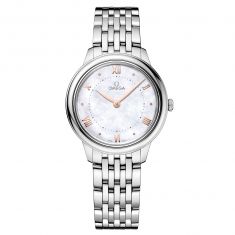In this 30 mm stainless steel model, the dial is crafted from white mother-of-pearl. The display is distinguished by PVD Sedna™ Gold colored hands, as well as alternating Roman numerals and cabochon indexes. The pure look of the timepiece is completed by a dotted minute track on the inner zone, and a full caseback embossed with a God Chronos medallion. This watch is presented on a stainless steel bracelet and is driven by the OMEGA Quartz Calibre 4061, with a battery life of at least 48 months.