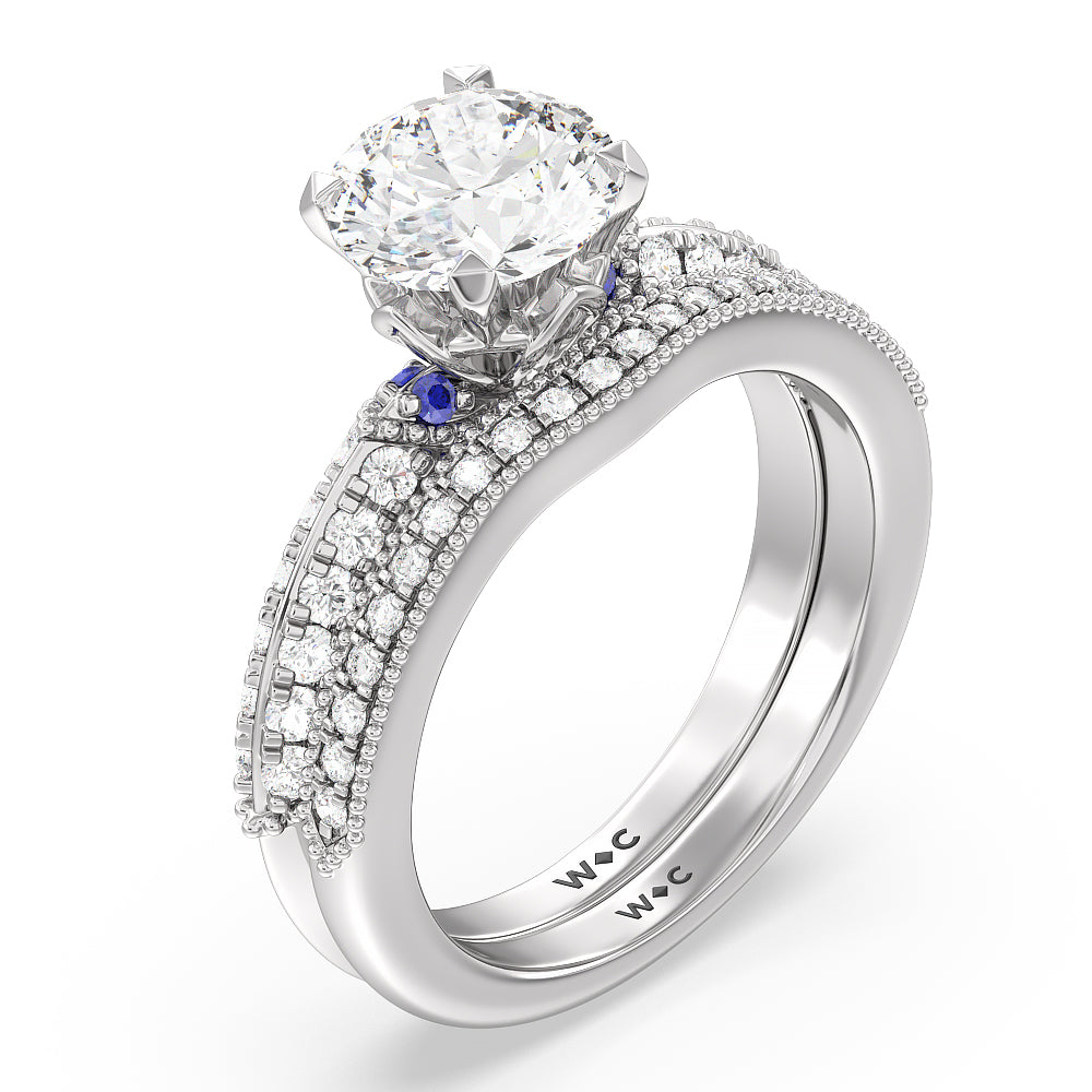This sparkling diamond studded knife edge engagement ring is inspired after the rarest blue Orchid. Completing the look is a fine milgrain and created blue sapphire shouders with a decorative Orchid basket.