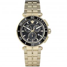 From Versace’s Greca Chrono collection, this sophisticated and practical watch will monitor your valuable time in style, sure to become a cherished staple accessory of your everyday life. Featuring a 45mm ion-plated yellow gold stainless steel case and bracelet, this remarkable Swiss-made timepiece is as resilient as it is handsome, with water-resistance up to 5ATM. It is powered by quartz chronograph movement, and the black Greca-patterned dial exhibits 3 sub dials, a gold-tone Medusa-head embellishment at 12 o’clock, a date window at 4 o’clock, a minute track, and luminous accents for easy readability at night or in dim lighting.