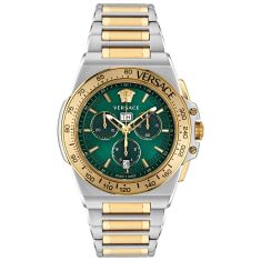 A new masculine timepiece with a bold 45mm case body enriched with a chrono movement and window date at 6h and day date at 12h. The dial is enriched with a greca on the inner ring while the top ring features bold logo numbers.